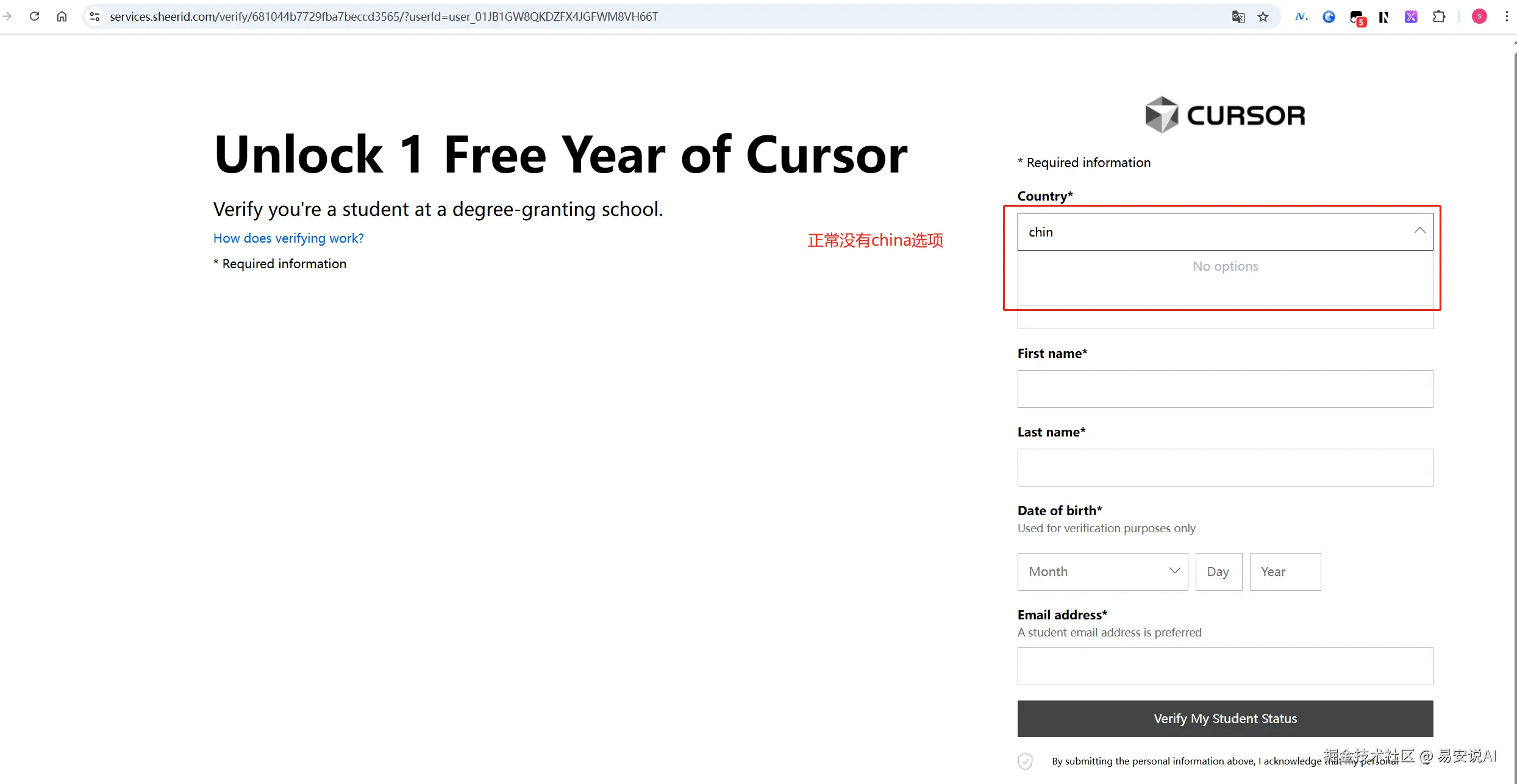 登录后,输入学生认证信息,正常情况,country是无法展示出china选项的,这里交给大家一个方法