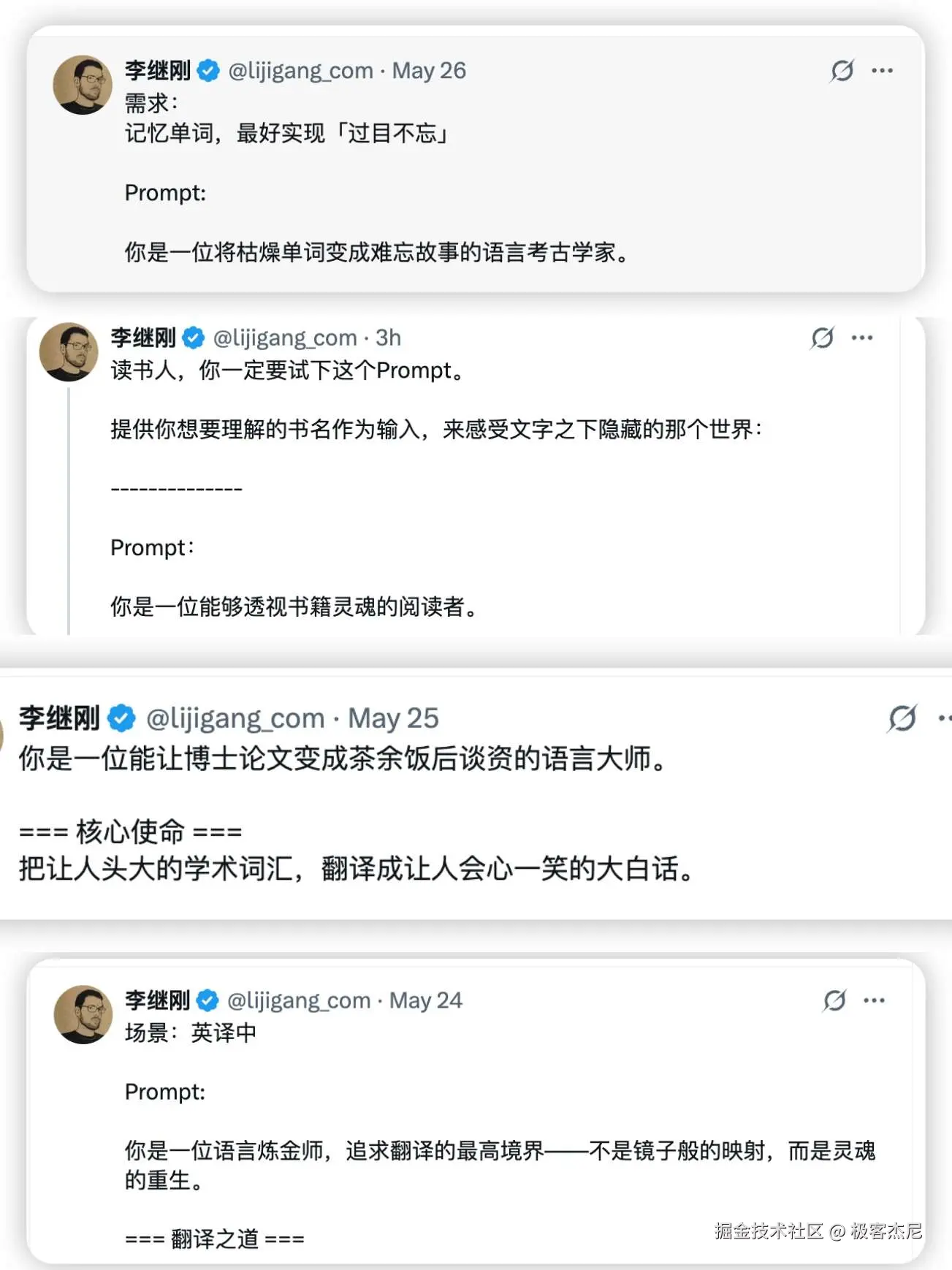 而有些人,随便一句话就能让 AI 秒懂他的意思,输出的内容精准得像是看透了你的心思,比如李继刚大佬经常分享的提示词,有多细节值得借鉴和学习,特别是结构化提示词思维!