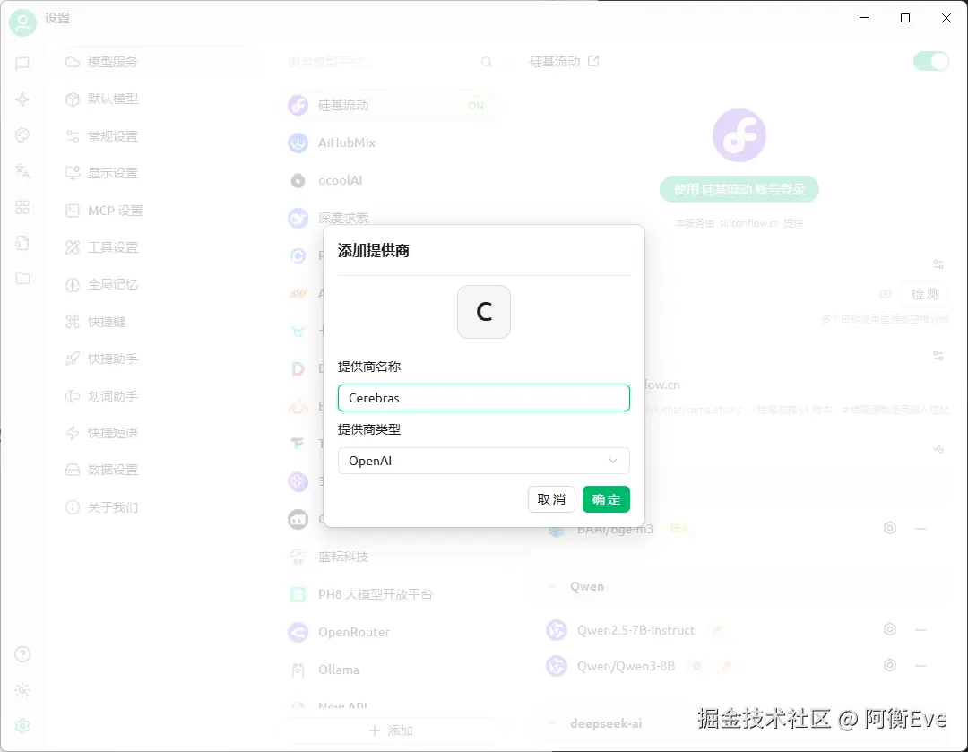 1、设置 -> 添加,提供商名字随意,提供商类型选择 OpenAI