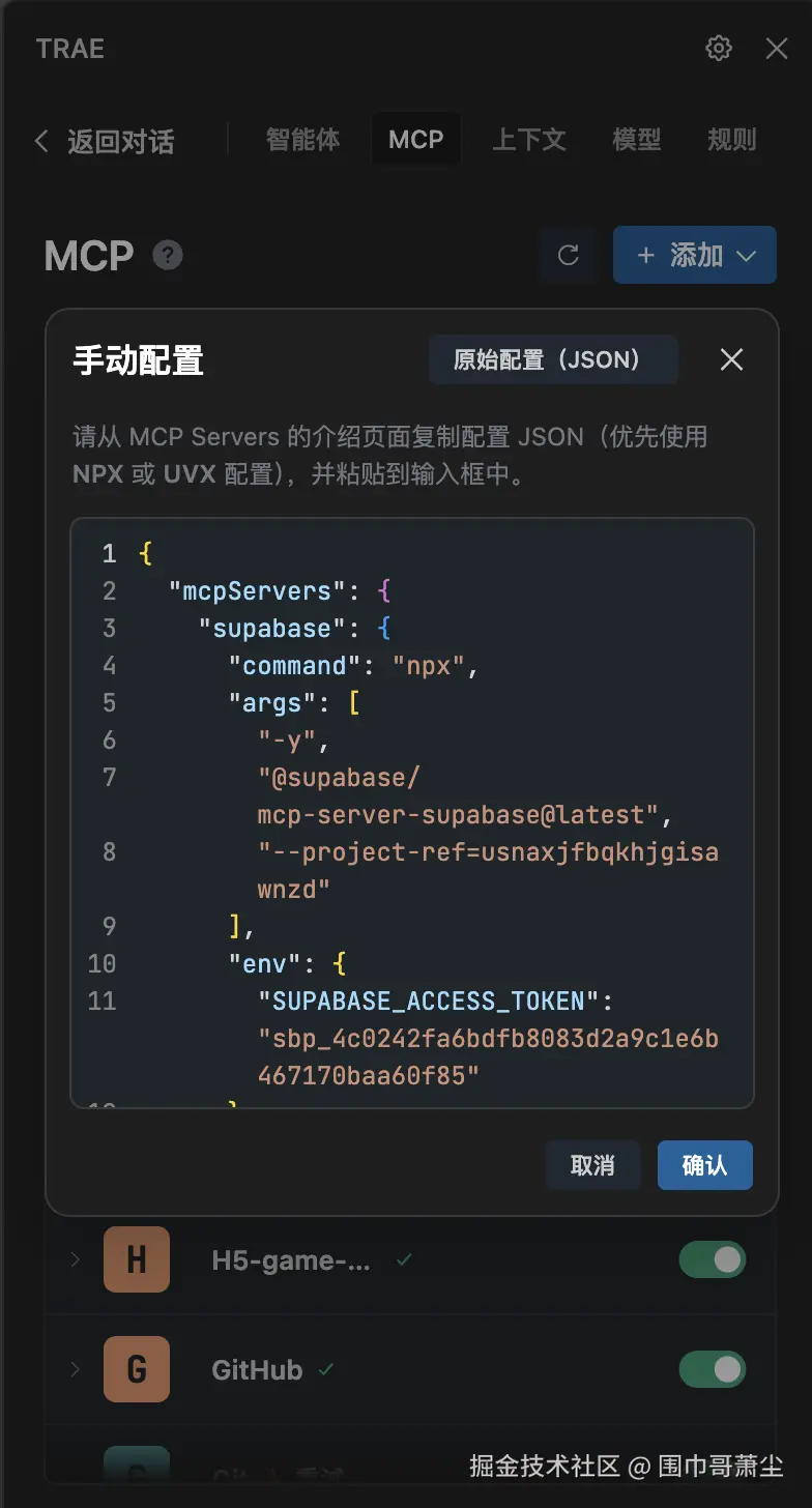 • 要使 MCP 能够操作 Supabase 数据库,首先需要完成 MCP 的配置。