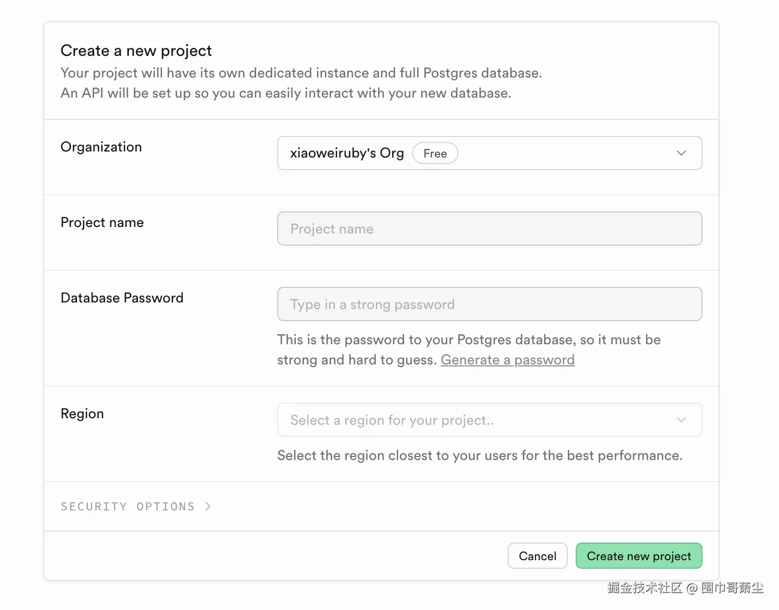 • 首先需要创建一个新的 Supabase 项目