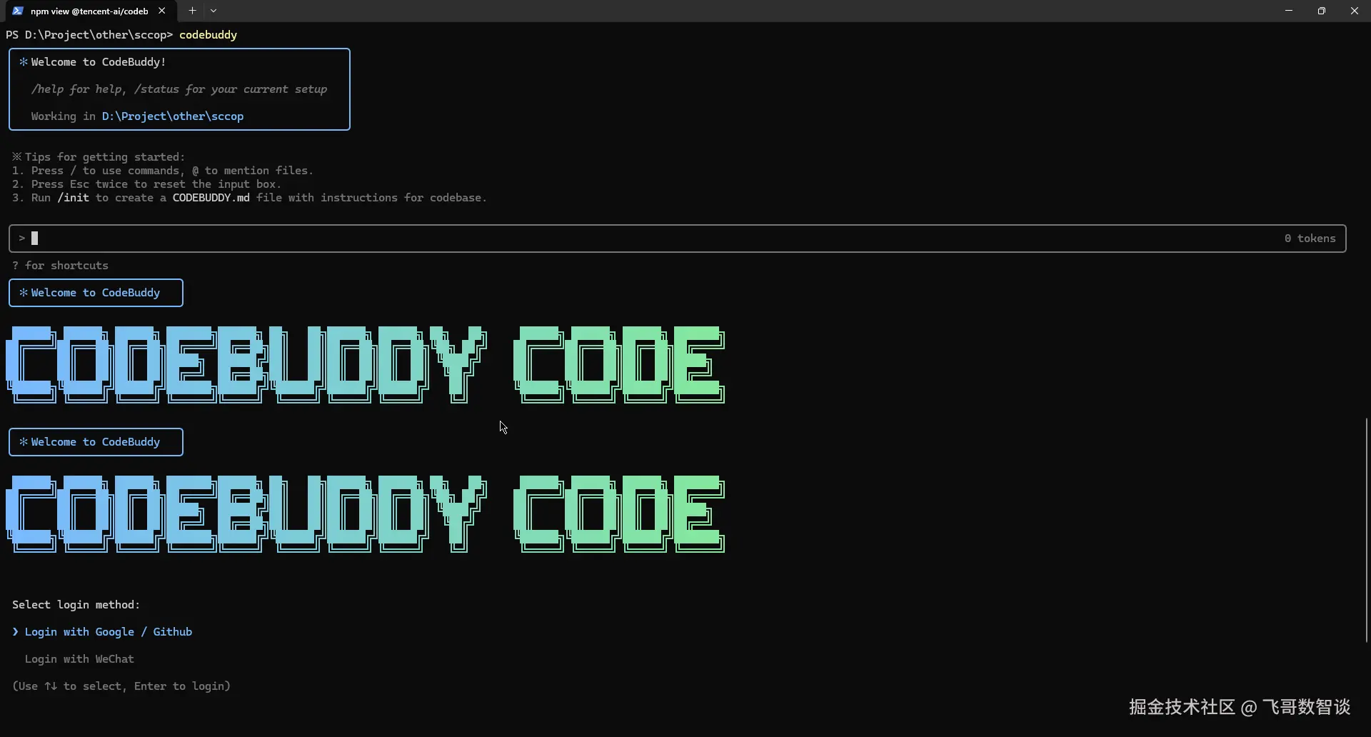 安装完成后,进入到项目目录,通过 codebuddy 启动 CodeBuddy CLI。