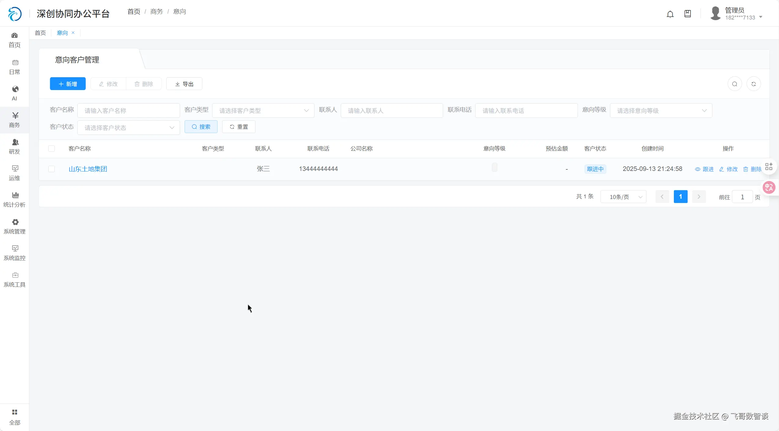 帮我实现一个意向跟踪模块,商务模块下级模块,主要用于销售登记各种意向客户,并支持每次更新跟进情况。