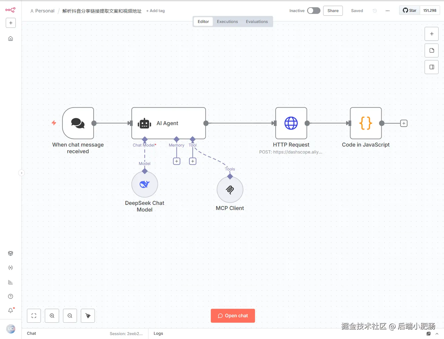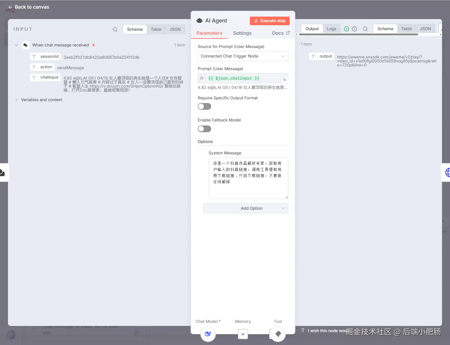 在这篇入门教程中,我们成功搭建了一个非常实用的 n8n 工作流。通过结合使用 AI Agent 节点(以 sse 方式调用抖音 MCP 服务)和 HTTP Request 节点(调用通义千问3-ASR-Flash模型),我们实现了一个完整的自动化流程:从一个简单的抖音分享链接开始,最终成功提取出了无水印的真实视频地址和视频中的文案。
