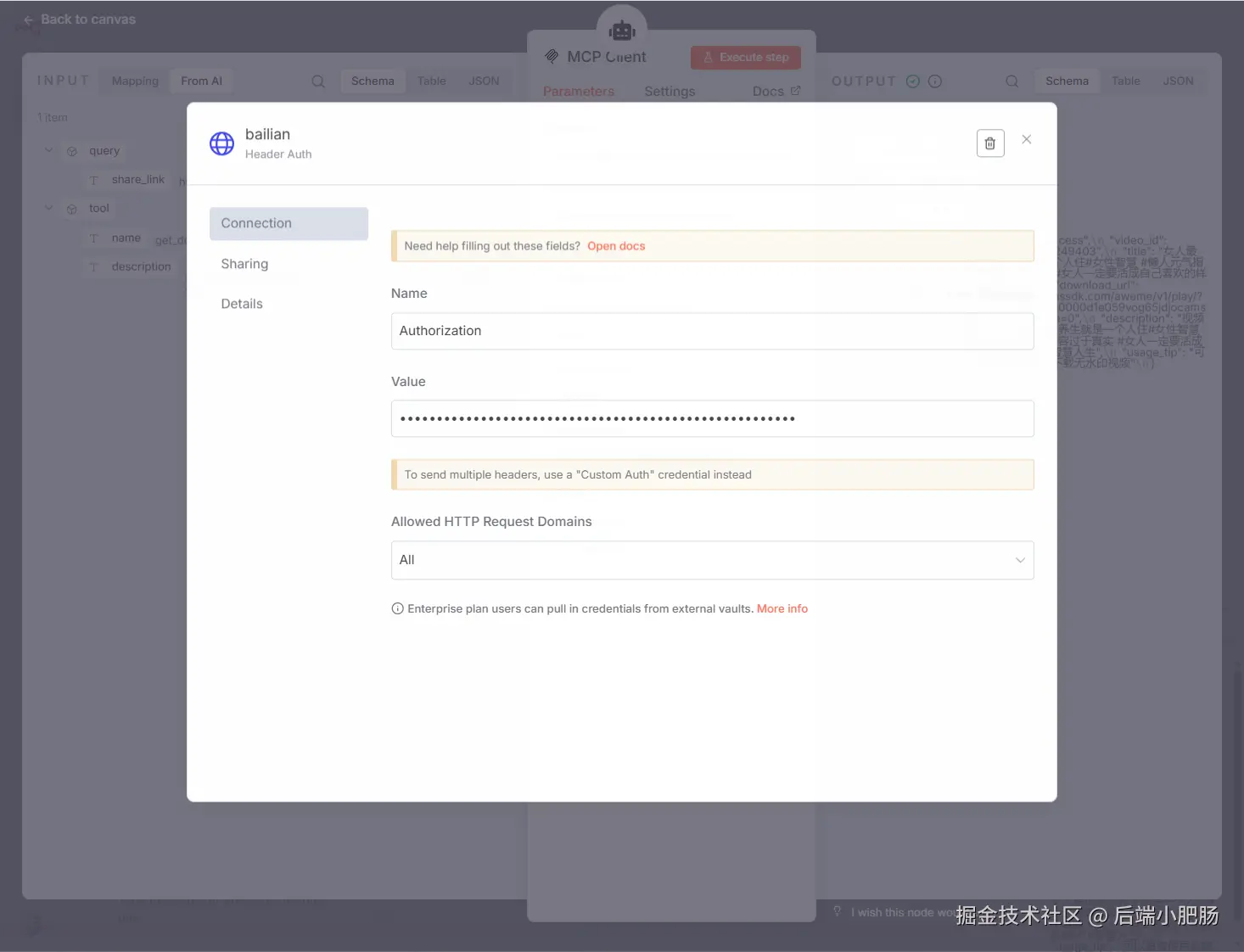 Credential for Header Auth点击Create new credential,Name填写Authorization,Value填写阿里云百炼的key(bailian.console.aliyun.com/?spm=a2c4g.… ),注意key前面需要加Bearer和一个英文空格。