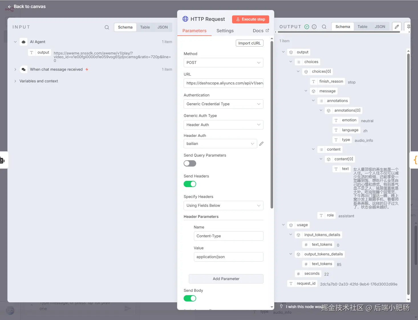 HTTP Rrquest: AI Agent节点后点击【+】添加HTTP Request。这个节点的作用是基于前置AI Agent节点输出的真实视频地址调用通义千问3-ASR-Flash模型来提取视频中的文案。