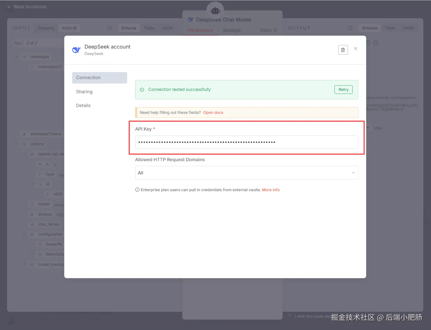 Credential to connect with项处点击【Create new credential】,去DeepSeek官网获取API Key(platform.deepseek.com/api_keys)填入… account表单中: