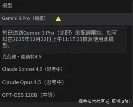早上来公司后打开编辑器,发现Google Antigravity 提示 Gemini3 Pro 达到配额限制了